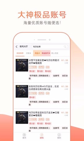 2. 进入应用首页,选择你心仪的游戏类型,点击后便能瀑布式展现所有的游戏账号;